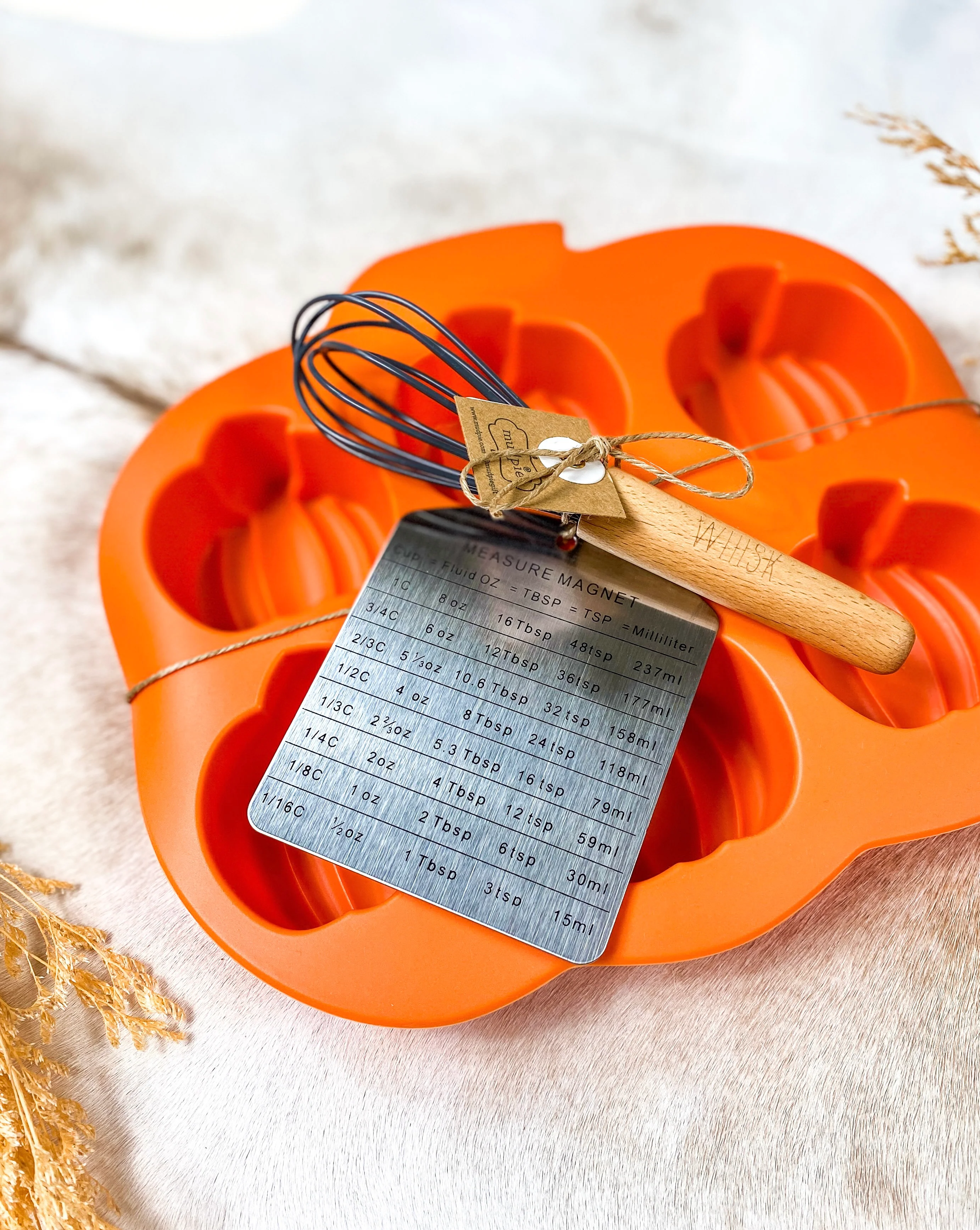 Get ready to bake with confidence and create delicious memories with our Pumpkin Silicone Baking Set. Perfect for autumn-inspired treats and Halloween parties, this three-piece set includes a premium silicone pumpkin baking mold, a versatile wood and silicone whisk, and a practical measurement conversion magnet. The intricately designed mold features six pumpkin shapes, adding a touch of festive charm to your creations. With convenient measurements and easy-to-clean features, this set is a must-have for every baking enthusiast.