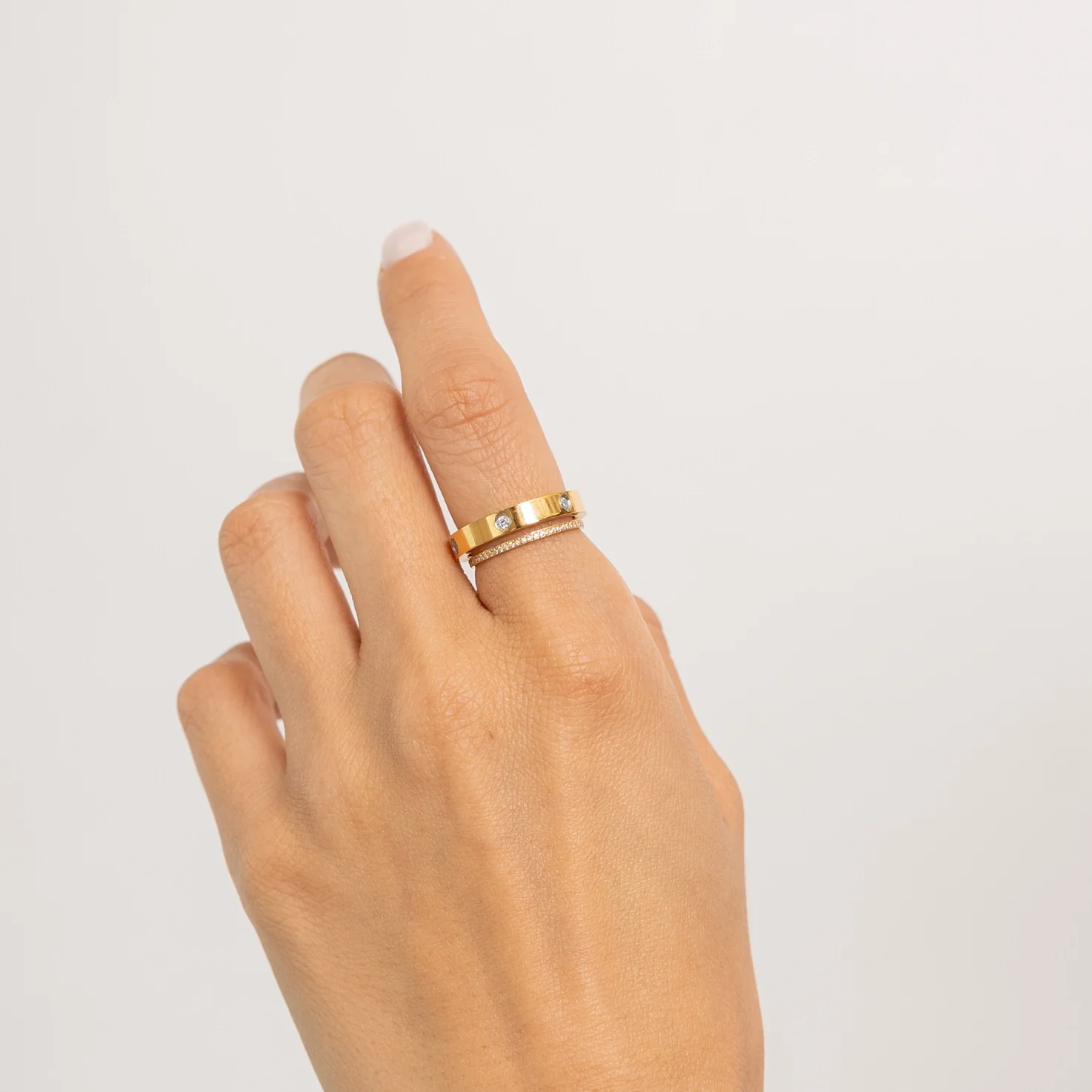 Designer Note: Add some bling to your fingers with our diamond ring band. Subtle yet stunning, it’s perfect for stacking or wearing solo. Made from stainless steel with a robust layer of 18K gold, waterproof and made to live in, featuring stones that look like real diamonds.