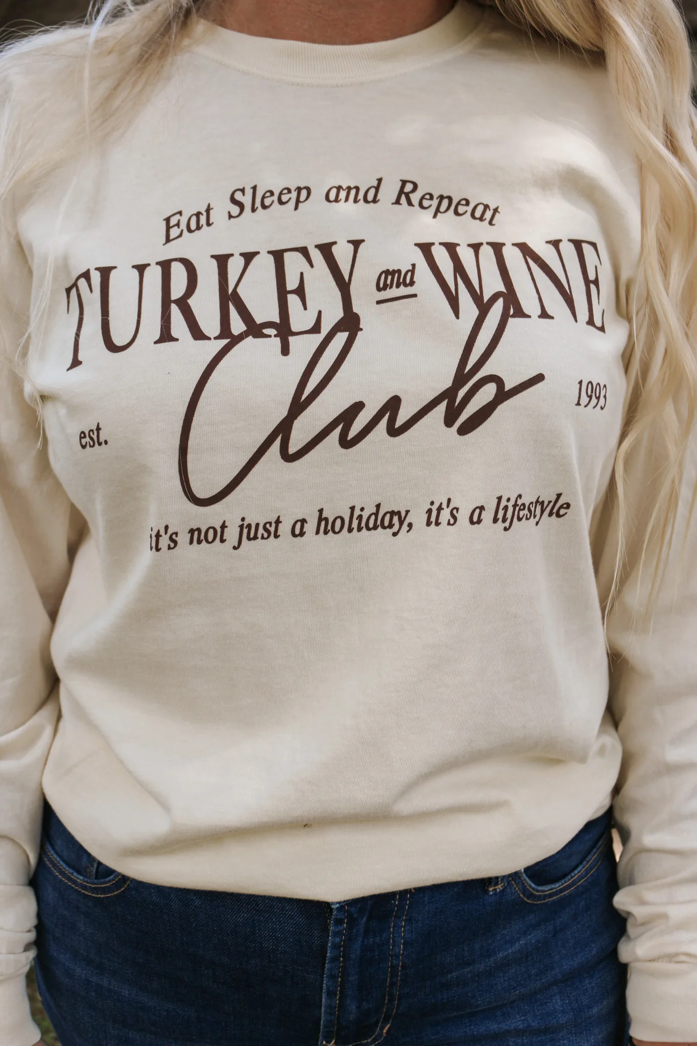 Be part of the turkey and wine club in style with this super soft long sleeve cream tee! It's not just a holiday, it's a lifestyle, so keep calm and eat, sleep, and repeat in this cozy shirt. Enjoy the good life!